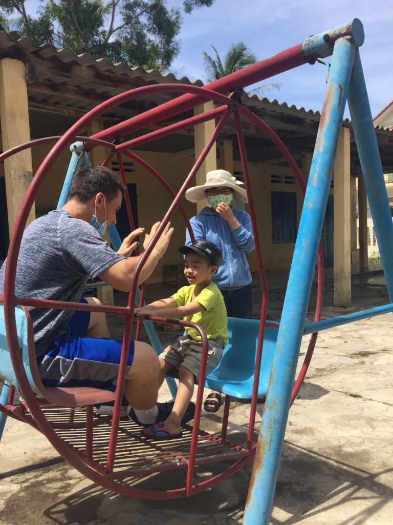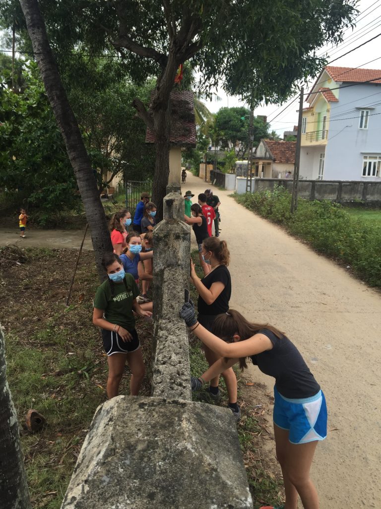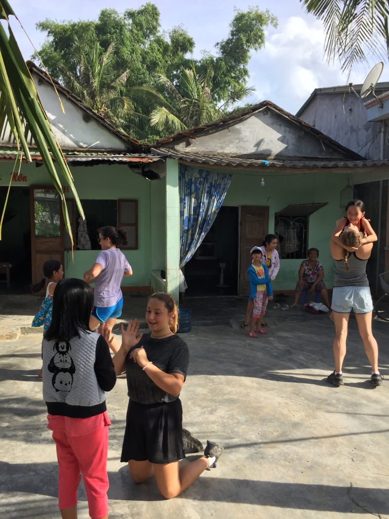 Ava, Lou, and Ally playing and dancing with the children at their work site.